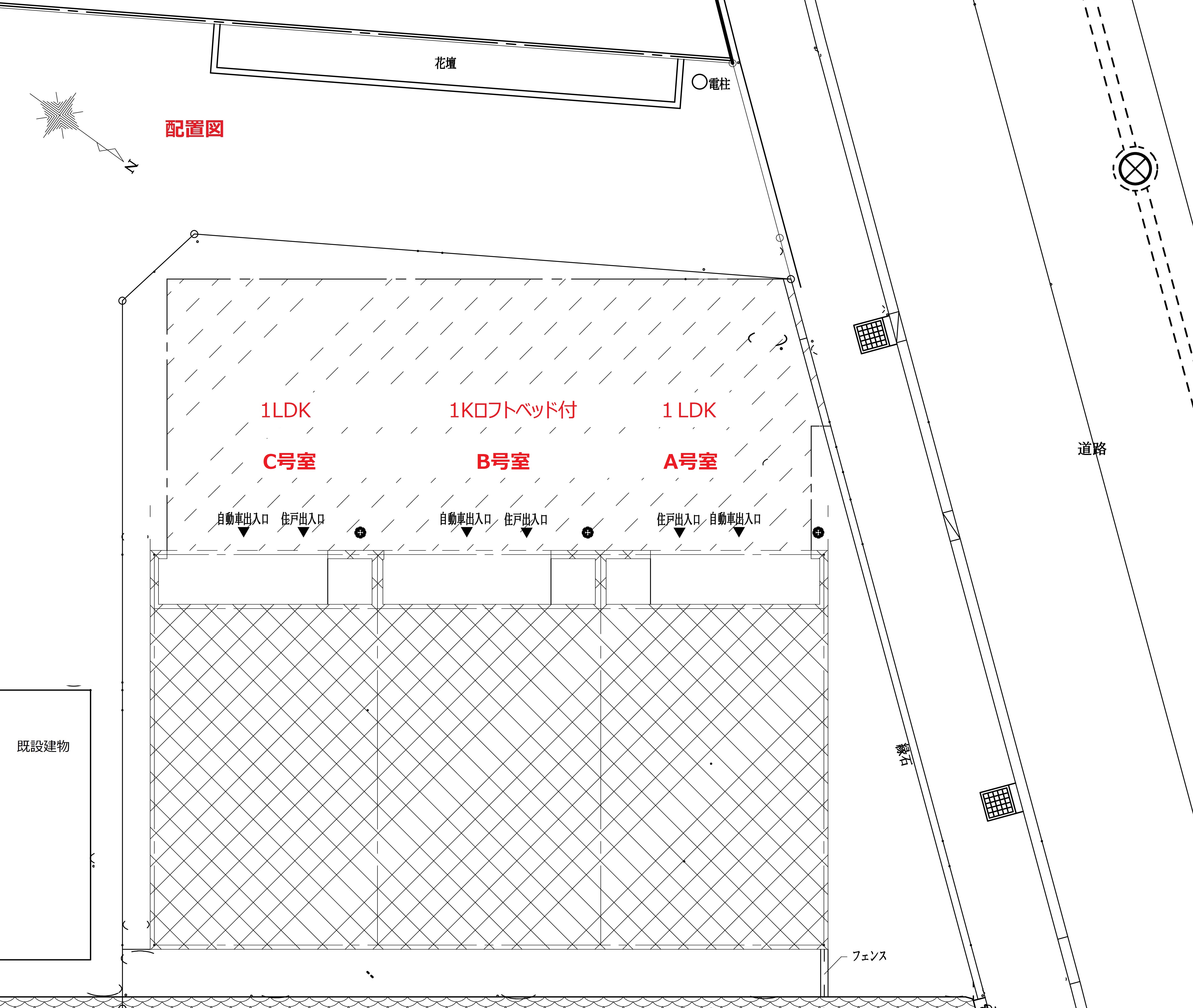 | C | 1LDK(LDK+1部屋) | ガレージ(最大部分)幅 3.6m × 奥行 6.9m | ー | シャッター 幅 2.7m × 高さ 2.2m | 入居中 |