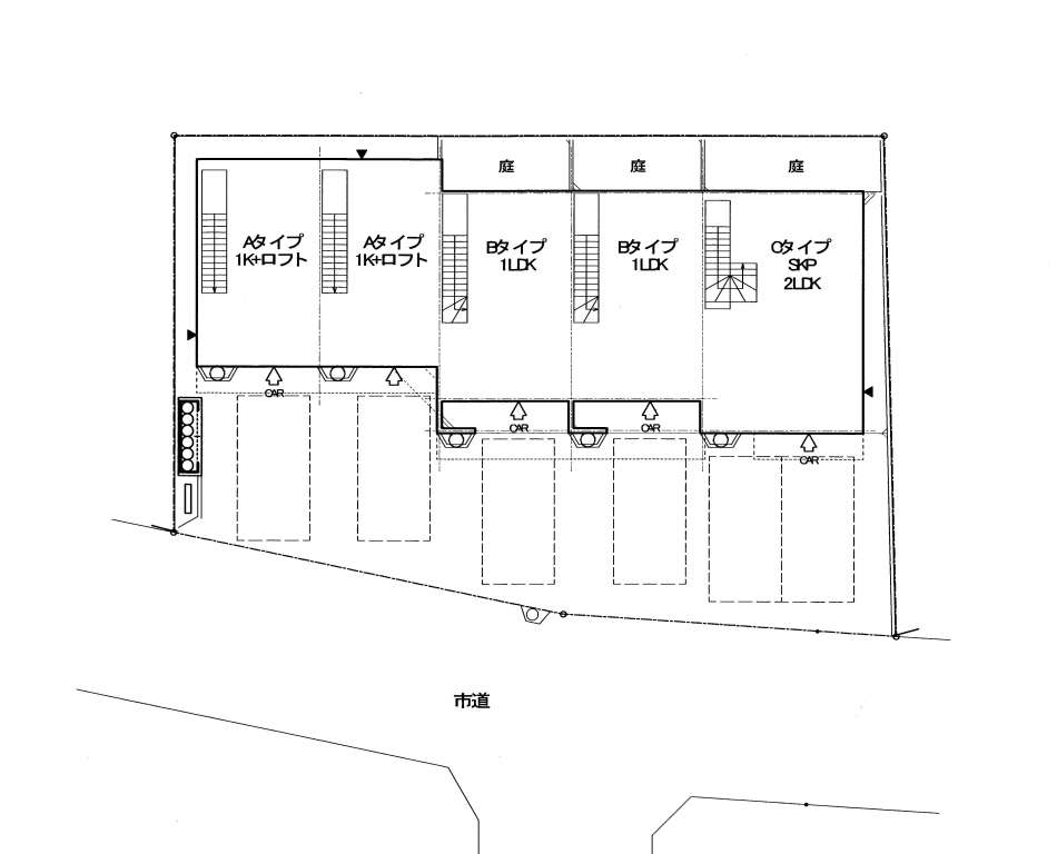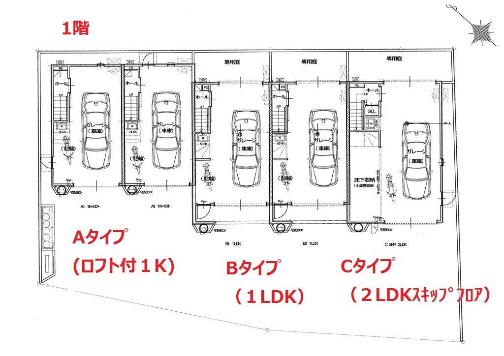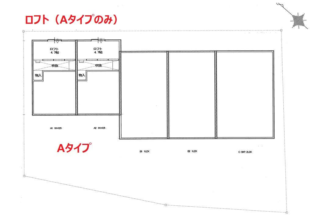 | A | ロフト付1K | LDK10.2帖+ロフト4.7帖 | ガレージ幅4.0m×奥行6.9m(最大部分) | ー | シャッター幅2.6m×高さ2.2m | 入居中 | ||
