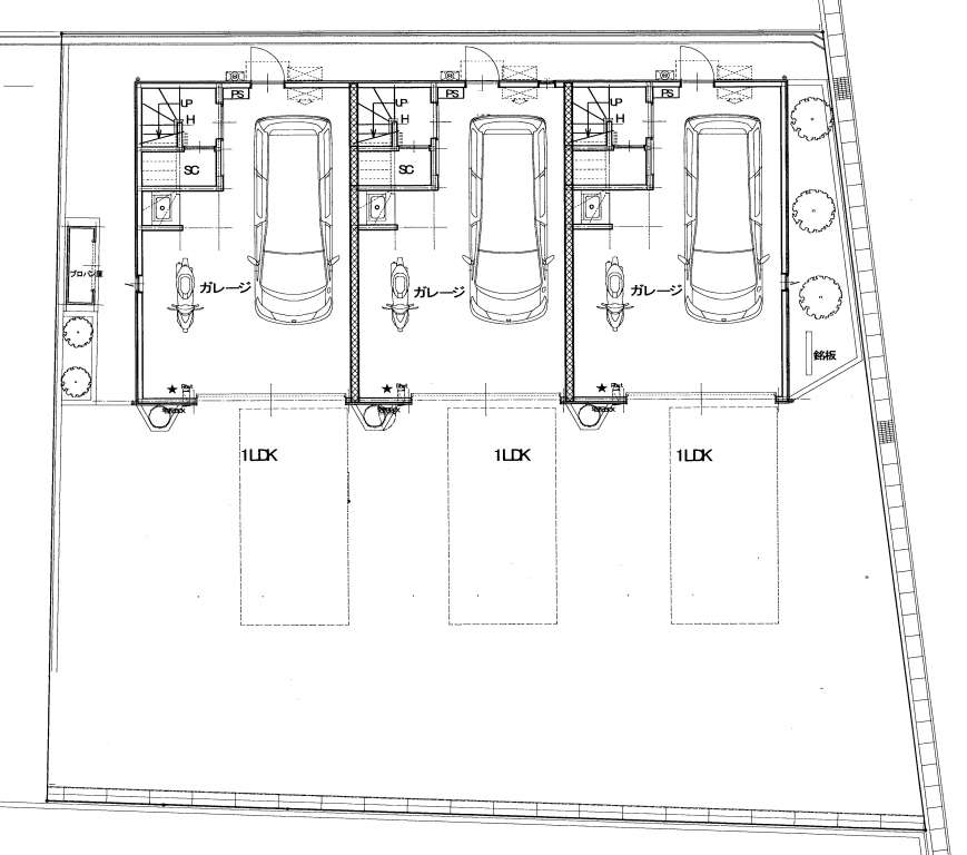 | B | 1LDK | LDK10帖+洋室4帖 | ガレージ幅4.9m×奥行7.1m(最大部分) | ー | シャッター幅3.4m×高さ2.2m | 入居中 | ||