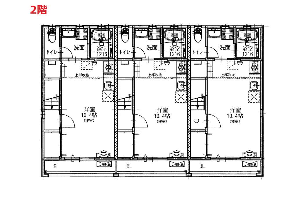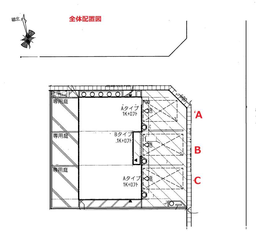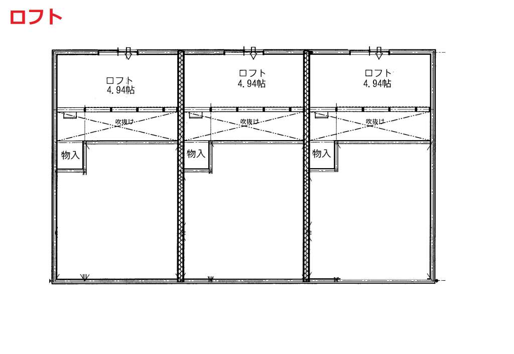 | B | ロフト付1K | 洋室10.4帖+ロフト4.9帖 | ガレージ幅4.0m×奥行6.28m(最大部分 | ー | シャッター幅2.6m×高さ2.2m | 入居中 | ||