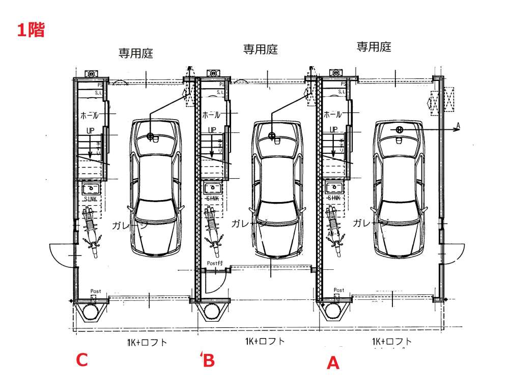 | C | ロフト付1K | 洋室10.4帖+ロフト4.9帖 | ガレージ幅4.0m×奥行7.28m(最大部分 | ー | シャッター幅2.6m×高さ2.2m | 入居中 |