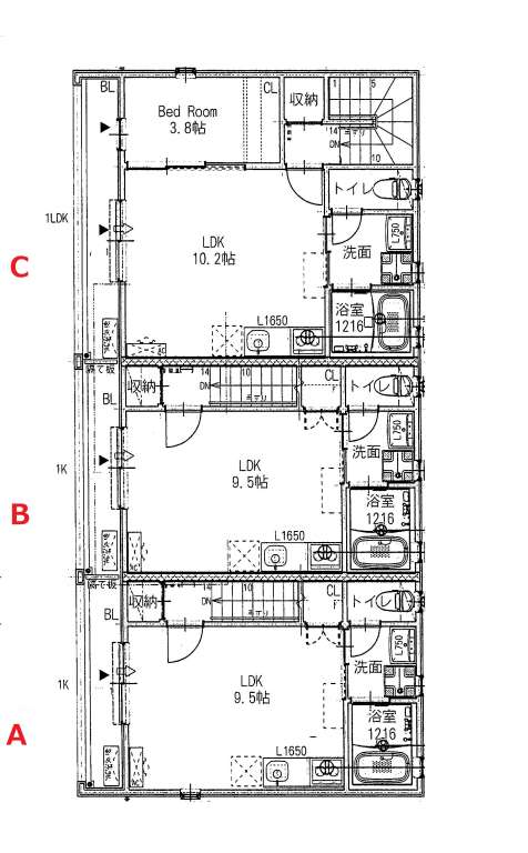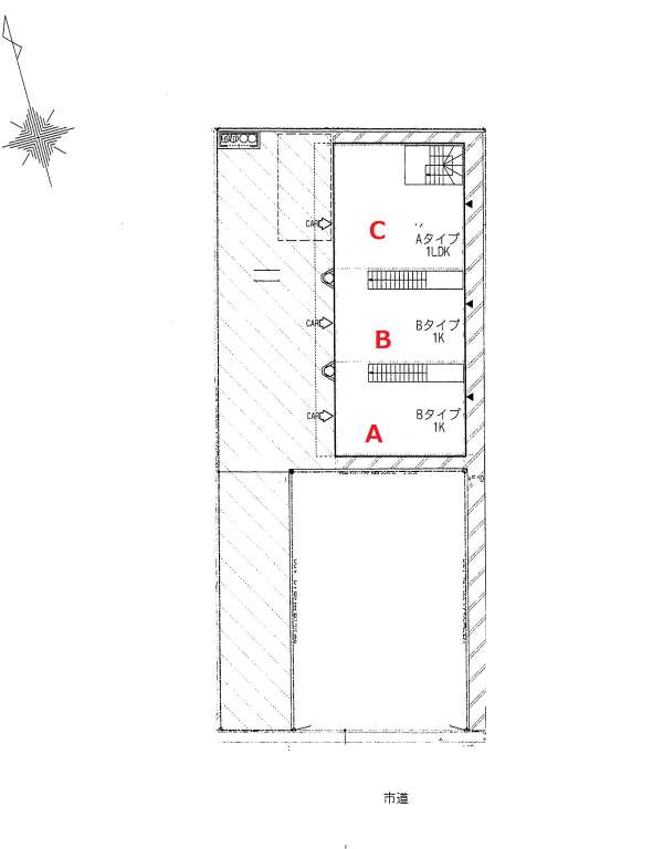 | B | 1K | LDK9.5帖 | ガレージ幅4.3m×奥行5.9m(最大部分) | ー | シャッター幅2.8m×高さ2.2m | 入居中 | ||