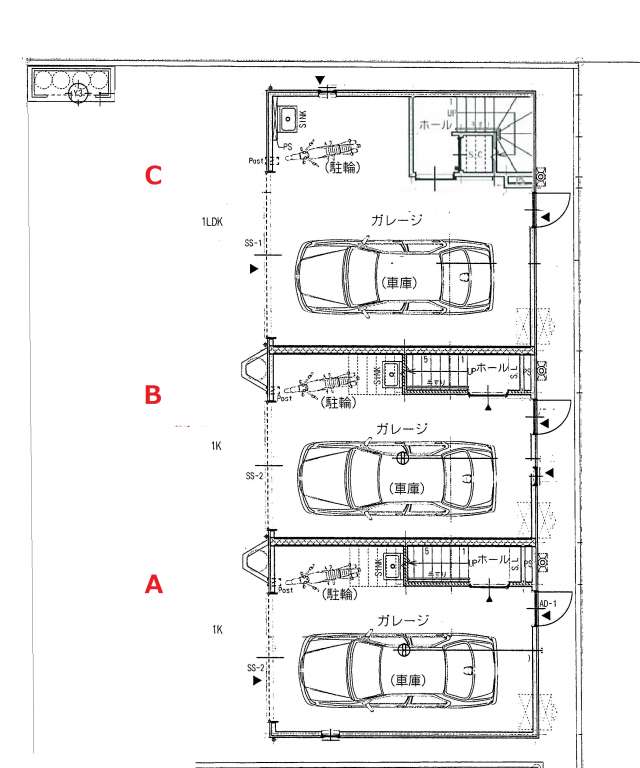 | A | 1K | LDK9.5帖 | ガレージ幅4.3m×奥行5.9m(最大部分) | ー | 保証金:¥71,000 礼金:¥71,000 シャッター幅2.8m×高さ2.2m | 入居中 | ||