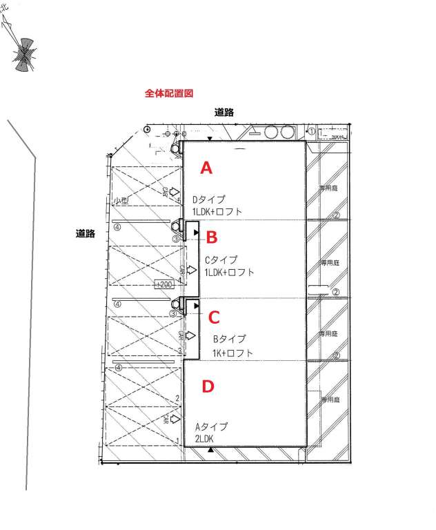 | A | 1LDKロフト付 | LDK12.8帖+寝室3.4帖 | ガレージ幅4.9m×奥行7.7m(最大部分) | ー | シャッター幅2.9m×高さ2.2m | 入居中 | ||