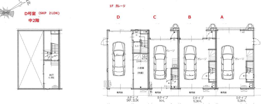 | D | 2LDKスキップフロア | LDK13.3帖+寝室3.9帖+納戸4.8帖 | ガレージ幅3.4m×奥行7.7m(最大部分) | ー | シャッター幅2.8×高さ2.2m | 入居中 |