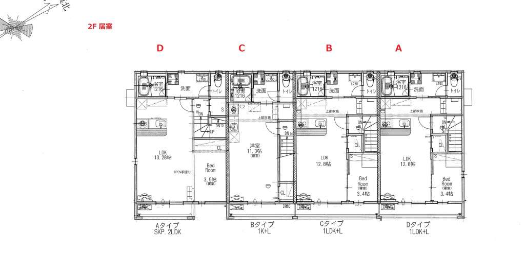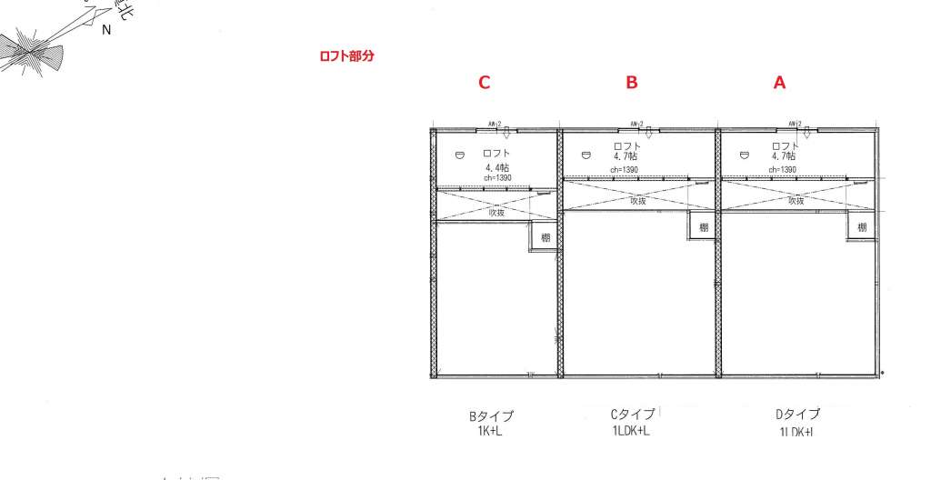 | C | ロフト付1K | LDK11.3帖 | ガレージ幅3.9m×奥行6.6m(最大部分) | ー | シャッター幅2.4m×高さ2.2m | 入居中 | ||