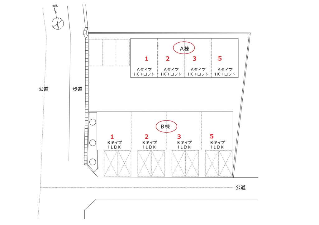 | B-5 | 1LDK | LDK11.7帖+洋室4.3帖 | ガレージ幅6.2m×奥行5.9m(最大部分) | ー | シャッター幅2.7m×高さ2.1m | 入居中 |