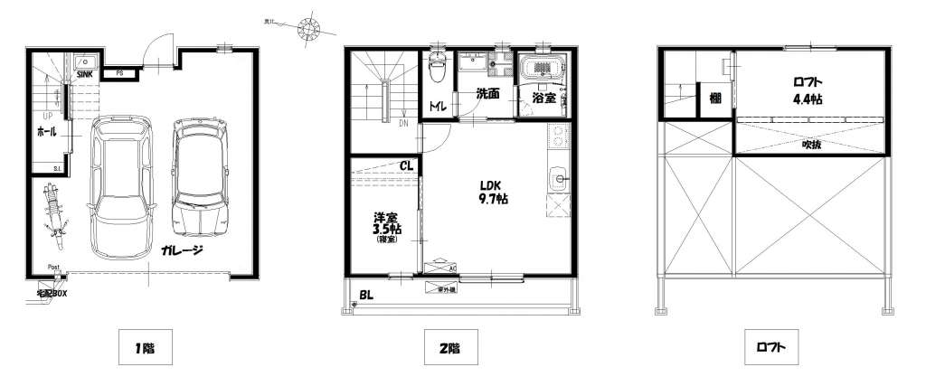 | 02 | 1LDK+ロフト(A) | LDK9.7帖+Bedroom3.5帖 | ガレージ内2台ガレージ幅5.8m×奥行5.8m(いずれも最大部分) | ー | シャッター幅4.1m×高さ2.2m | 入居中 | ||